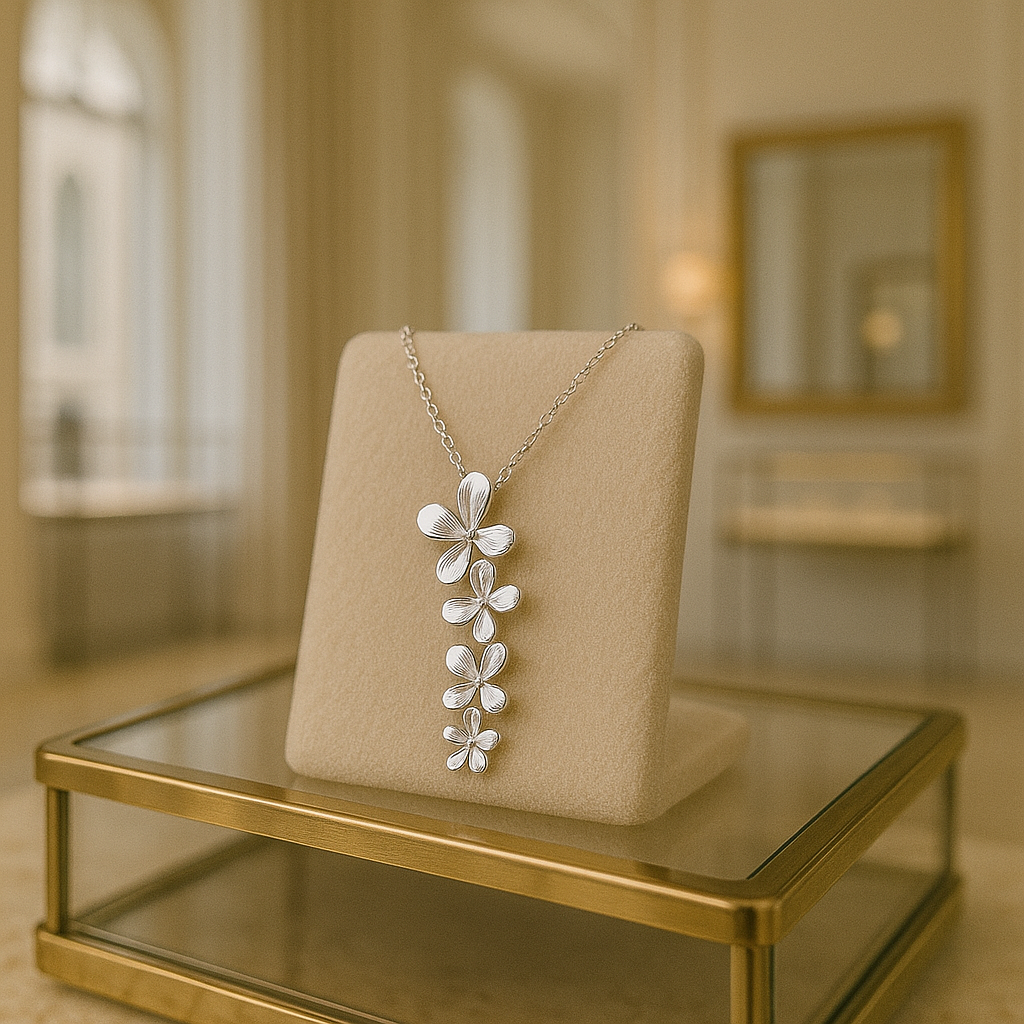 Un homenaje a la naturaleza en su forma más refinada. Este collar presenta un delicado conjunto de flores en caída vertical que realzan la feminidad y aportan un toque romántico a cualquier look.