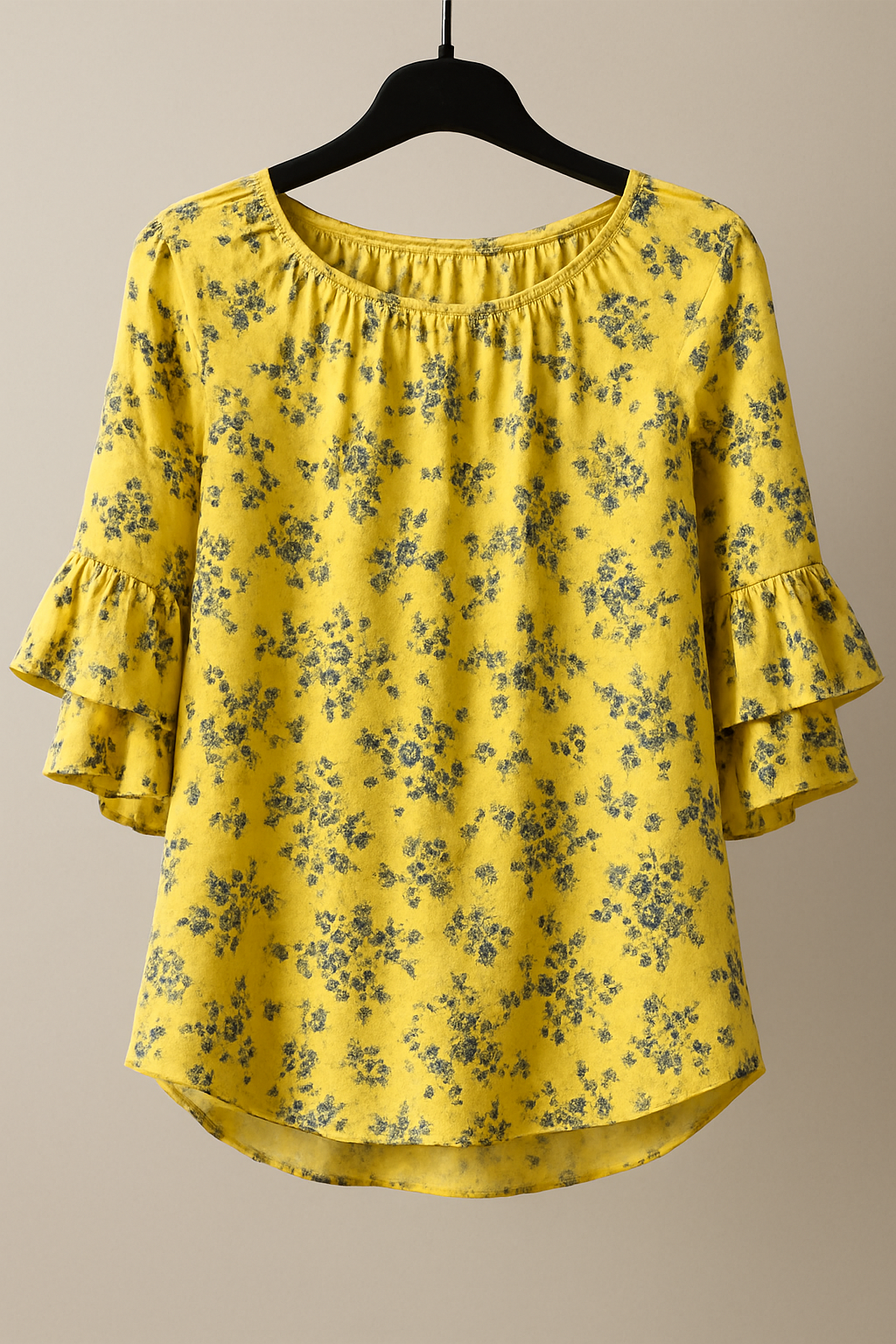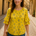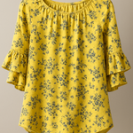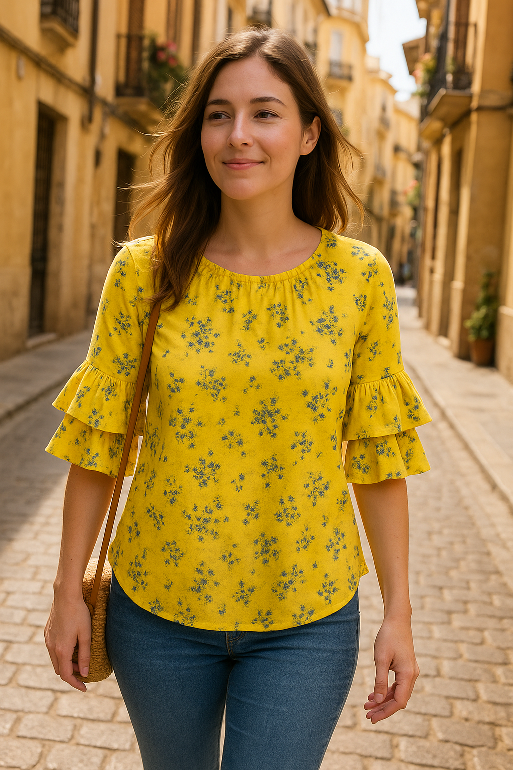Su estampado floral delicado la convierte en la prenda perfecta para realzar tu feminidad, mientras que las mangas con volantes de media longitud aportan movimiento y elegancia. El cuello redondo clásico le da un aire versátil, ideal tanto para ocasiones casuales como para momentos especiales.