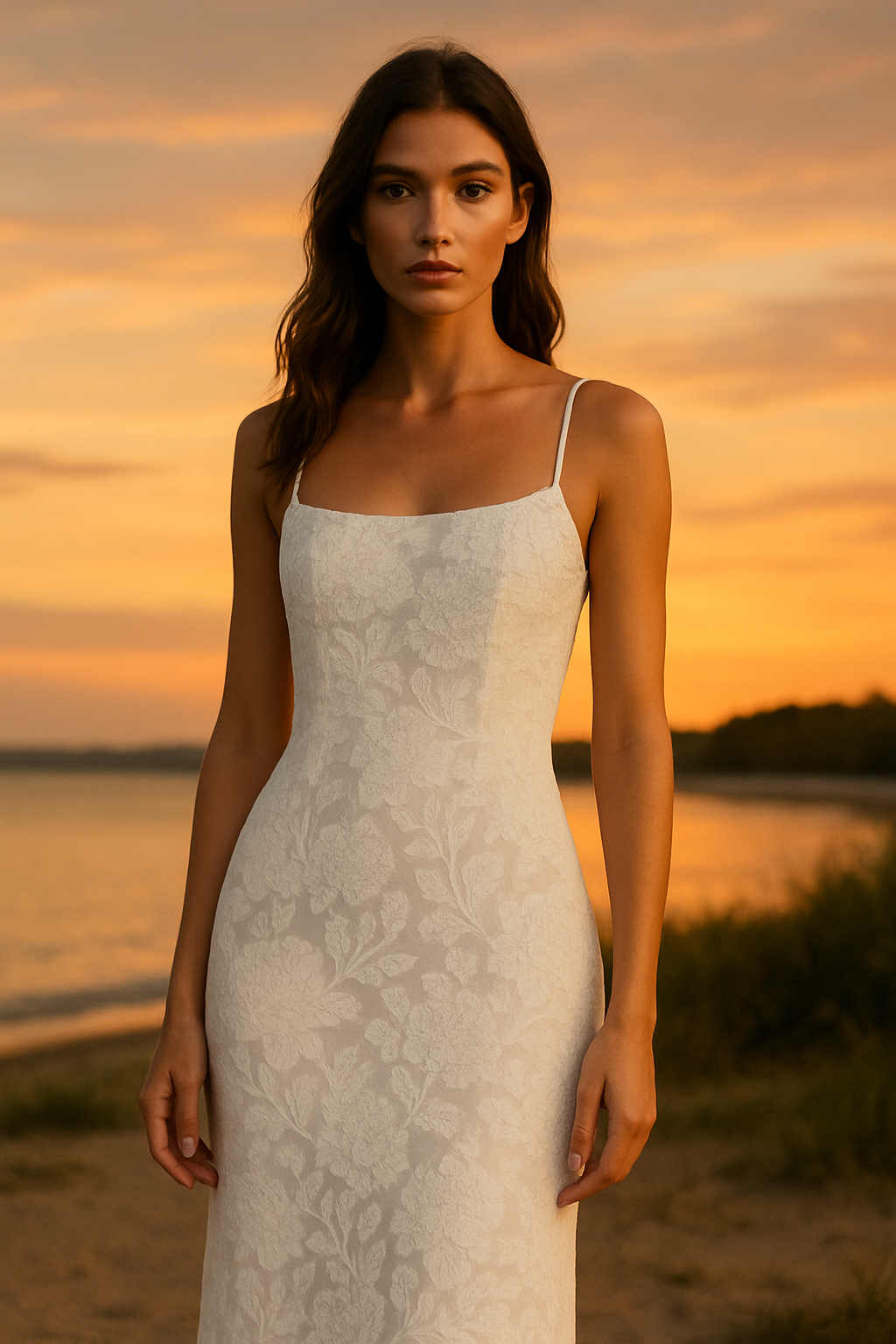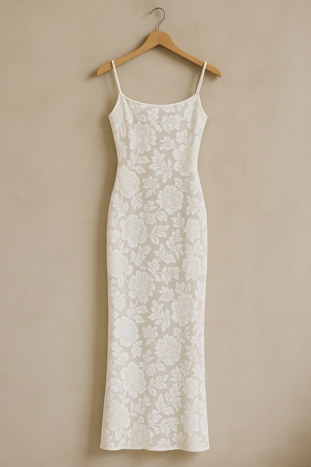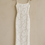 Elegancia pura y estilo atemporal. Este vestido largo de tirantes finos presenta un delicado encaje floral blanco sobre una silueta ajustada que realza la figura. Ideal para eventos especiales, cenas románticas o celebraciones de verano. Combínalo con tacones neutros y accesorios dorados para un look sofisticado.